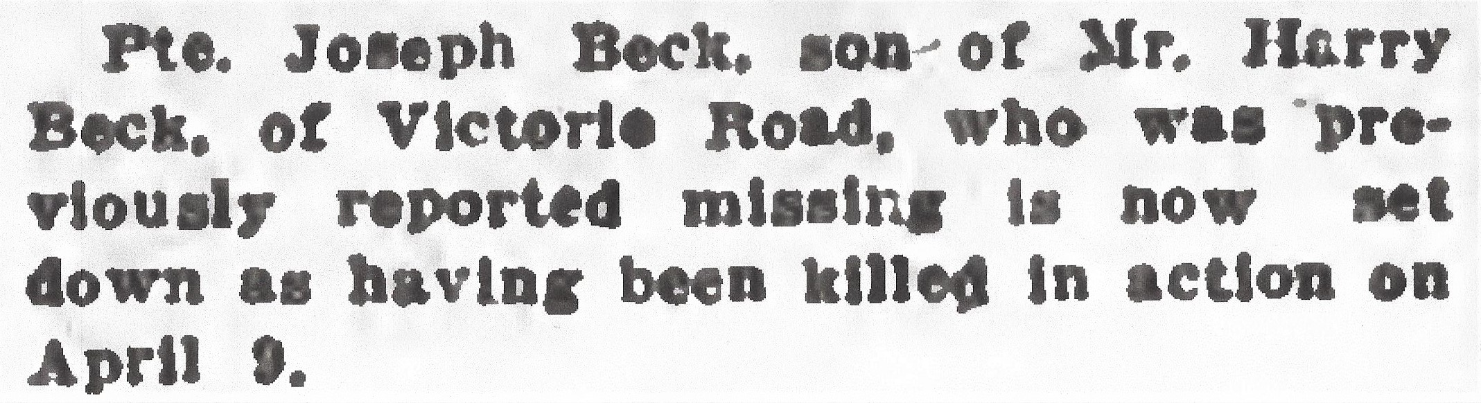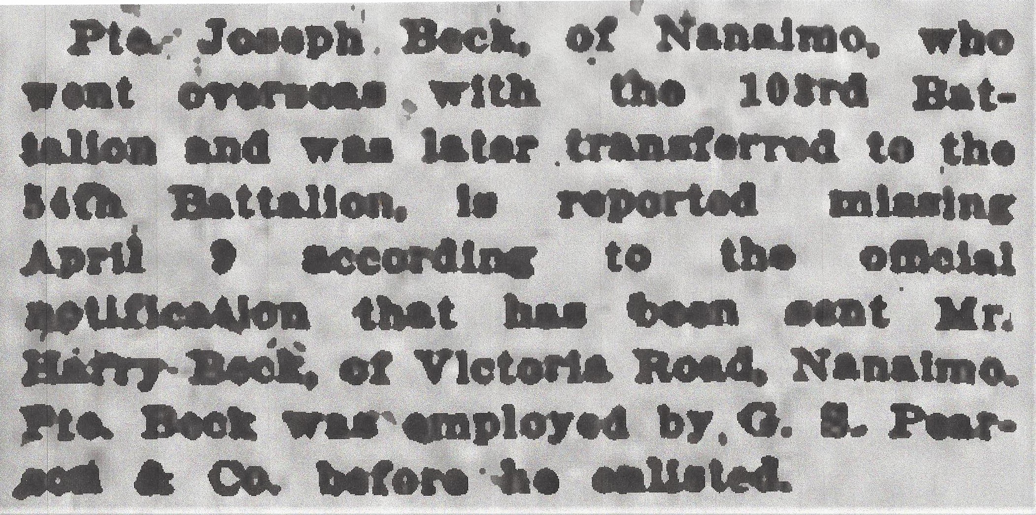 Son of Henry and Jane Beck, of 1032, Victoria Rd., Nanaimo, British Columbia. Native of Lamplugh, Cumberland, England.