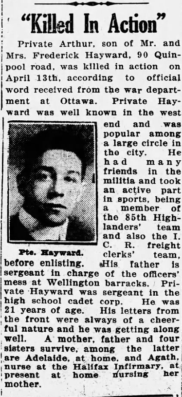 Son of Frederick Henry and Agatha Constance Hayward, of Wolseley Barracks, London, Ontario.