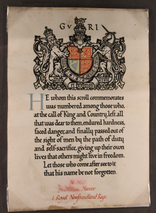 In BEAUMONT HAMEL MEMORIAL PARK, which was officially opened by Earl Haig on June 7, 1925, the monument of the great bronze caribou, emblem of the Royal Newfoundland Regiment, stands on the highest point overlooking St John's Road and the slopes beyond. At the base of the statue three tablets of bronze carry the names of over 800 members of the Royal Newfoundland Regiment, the Newfoundland Royal Naval Reserve, and the Mercantile Marine who gave their lives in the First World War and have no known grave. In the lodge, which houses the reception room for visitors to the Park, a bronze plaque, unveiled in 1961 by the Hon. Joseph Smallwood, Premier of Newfoundland, lists the Battle Honours won by the Royal Newfoundland Regiment and pays tribute to its fallen.