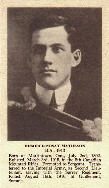 Son of Rev. John Matheson and Christy Ann Elizabeth Matheson,of Cornwall, Ontario. Enlisted March, 1915 in 5th Canadian Mounted Rifles. Gazetted to 11th Battalion East Surrey Regiment, September, 1915.