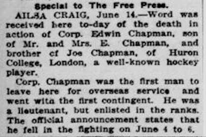 No.1 Coy. Son of Mrs. Jennie Chapman, of Ailsa Craig, Ontario.