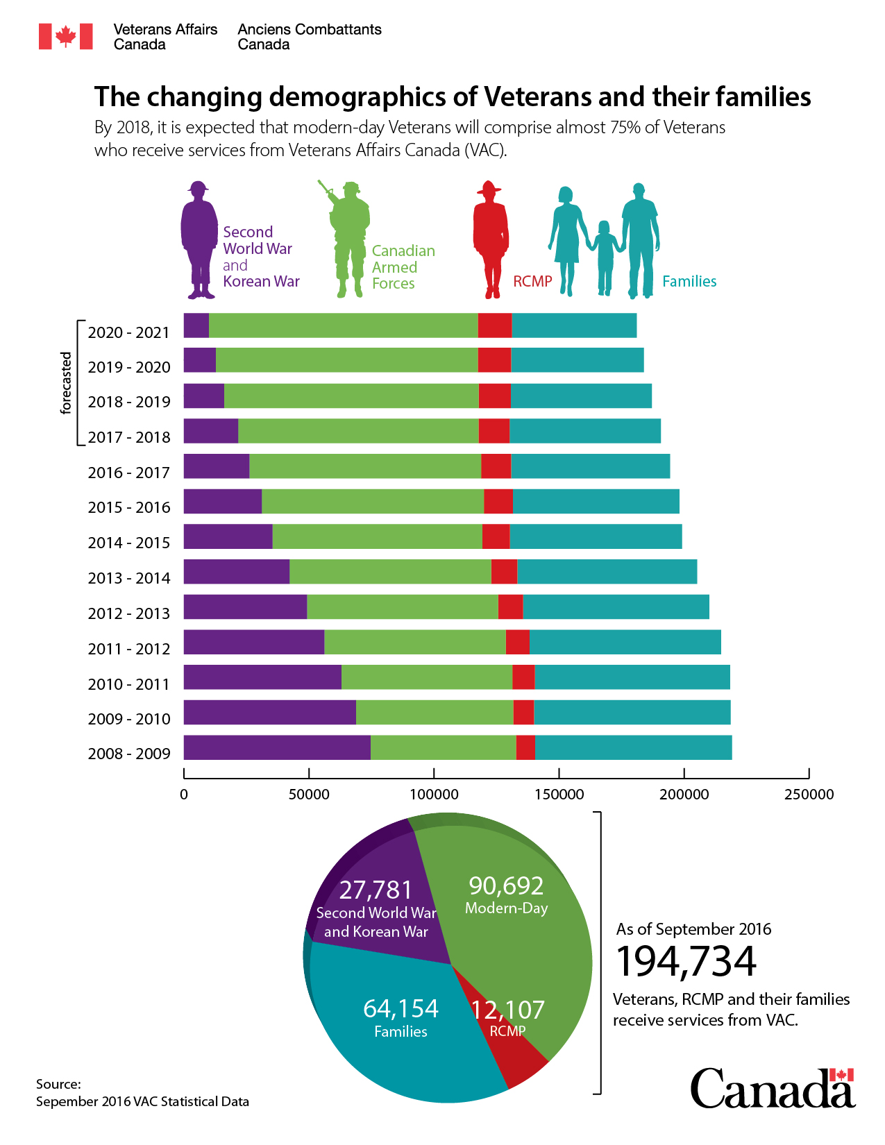 There are approximately 670,100 Veterans in Canada, and 95,000 serving CAF members. VAC provides services to nearly 200,000 Veterans, family members, RCMP members and others who require support. Ranging in age from 18 to 100, Veterans fall into two main categories: traditional Veterans who served in the Korean War or earlier, or modern-day Veterans, who served after the Korean War.