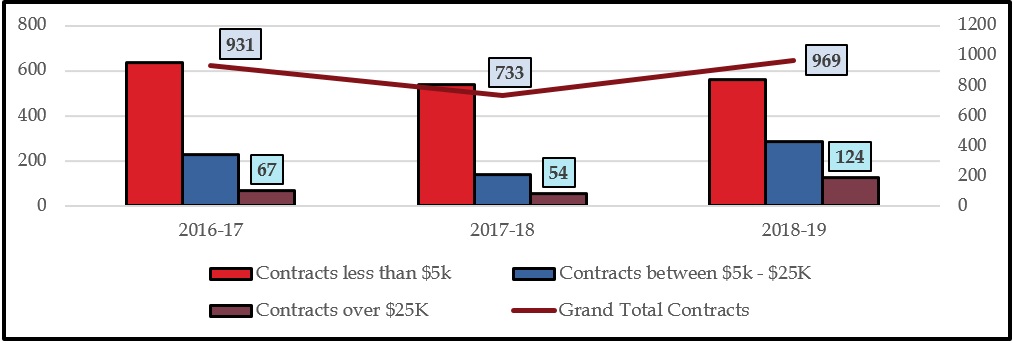 According to Chart 1, the overall number of contracts processed has remained consistent, which suggests the workload of the contracting unit is generally stable. Comparing the 2016-17 and 2018-19 fiscal years, it was determined total number of new contracts were similar in volume. Subsequent analysis revealed that new contracts over $25,000 more than doubled in the 2018-19 fiscal year compared to the two previous fiscal years (2016-17 and 2017-18) which points to an increase in workload for contracting specialists during this period.