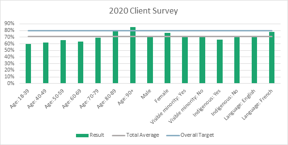 The target of 80% was reached only for Veterans who were age 90 and older. Satisfaction is lower for younger Canadian Armed Forces Veterans, with a 60% satisfaction rate for Veterans aged 18 to 39. The satisfaction rate for Indigenous Veterans was 63%, lower than the 71% satisfaction rate for non-Indigenous Veterans. The evaluation team recognizes the Program has taken steps to increase programming and awareness of modern-day Veterans and underrepresented groups, through increased promotion of their achievements and sacrifices. However, work remains to be done to reach the target level of satisfaction for the above noted groups. The next client survey (scheduled for summer 2022) will have further results to help inform decisions and the direction and adjustments needed to for future programming.