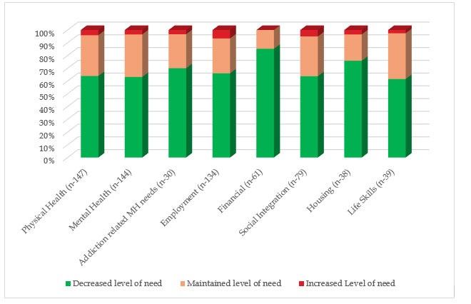 The evaluation team worked in collaboration with the Service Delivery and Program Management Division’s Business Intelligence Unit to assess results associated with RRIT-R and CNCI. In instances that these tools were completed at entry and when a Veteran was transitioned out of needing case management, key indicators/questions were analysed to determine if there was an improvement to the Veteran’s needs.