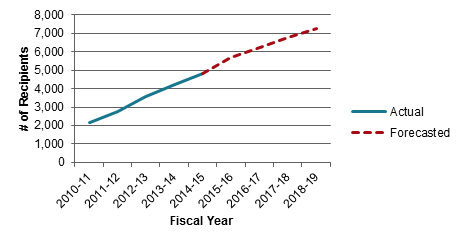 Program uptake and expenditures indicate continued need. Overall, the Program recipients and expenditures have increased and that growth is forecasted to continue. As shown in Chart 1, between 2010-11 and 2014-15, the number of recipients increased by 307% (from 2,196 to 8,935) and is forecasted to increase by 49% from 2015-16 to 2018-19 (from 11,245 to 16,705, respectively).