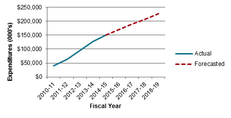 Chart 4 illustrates an expenditure increase of 278%, from $40M in 2010-11 to $151M in 2014-15. The forecast reflects future increased demand.