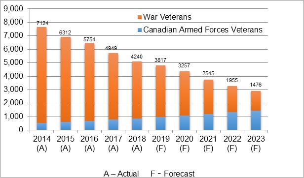 The number of CAF Veterans receiving support for long-term care is rising as the CAF cohort ages (as of March 2018, 32% of CAF Veterans receiving VAC benefits are over age 70 and 14% are over age 80). However, this is being more than offset by a declining war service long-term care population that is forecasted to decrease by 61% between 2019 and 2023.