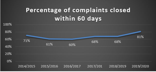 - In terms of timeliness, the percentage of cases closed within 60 days has increased from 61 percent in 2015-16 to 81 percent at this point in 2019/2020.