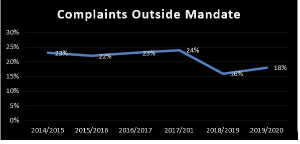 | Complaints Outside Mandate | 23% | 22% | 23% | 24% | 16% | 18% |