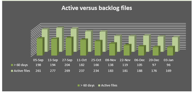 - In terms of the backlog, the number of files that have been active for more than 60 days has been reduced by 52 percent between September 2019 and January 2020, as shown in Figure 7 below.