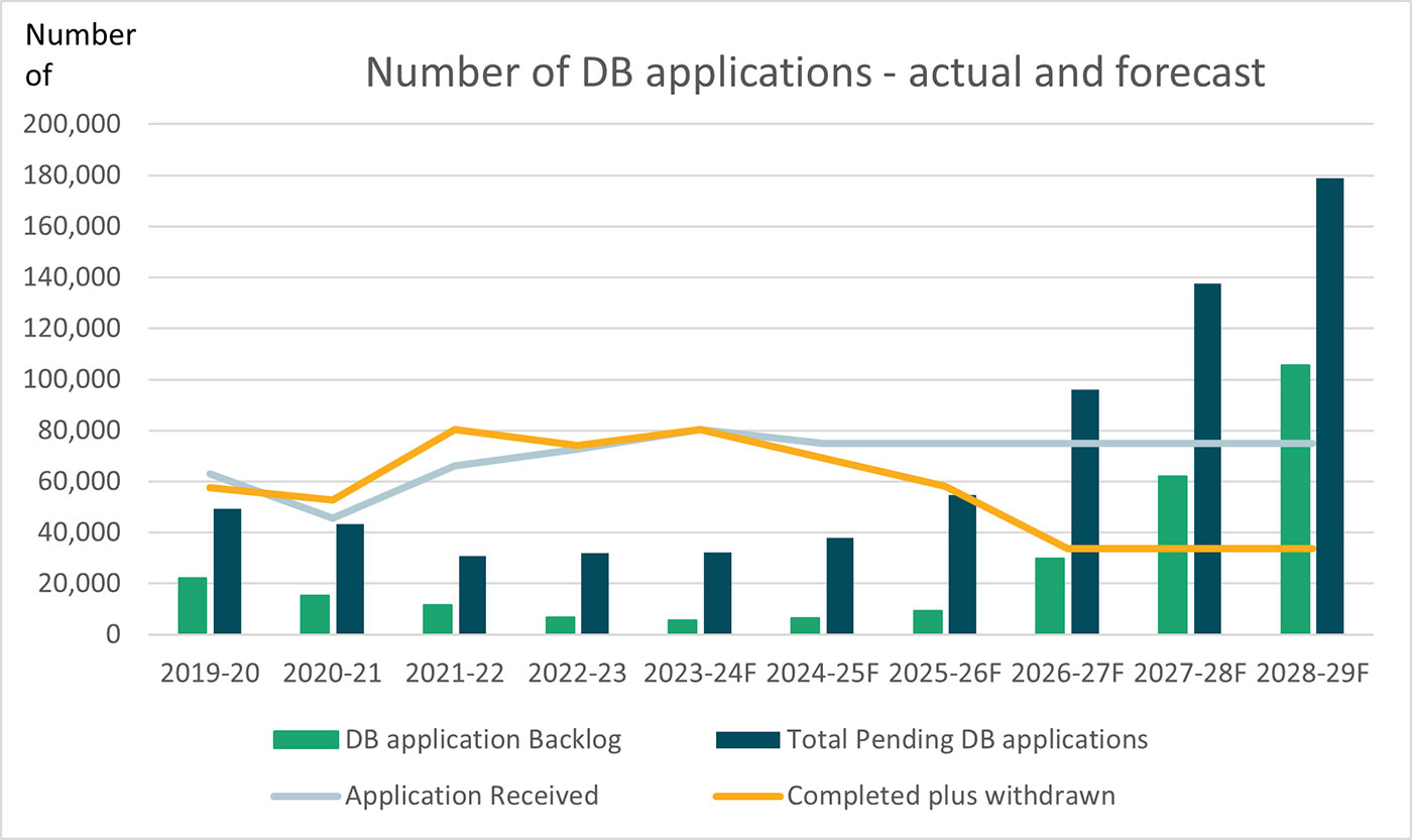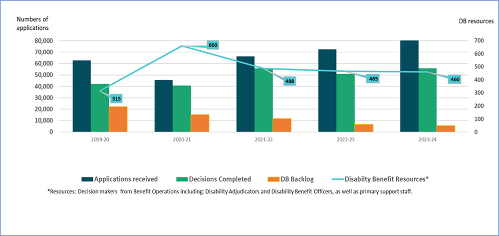 The main service standard for the DB program is that 80% of first applications will be completed within 16 weeks of an application that has all of the necessary information to render a decision. The number of applications taking longer than 16 weeks to be completed had been increasing between 2015 and 2020 due to the increasing number of applications being received by VAC and the increased complexity of some applications. VAC received temporary funds in 2020 to help address the high number of applications awaiting processing. The funding was renewed in 2022 and 2024, and has resulted in significant progress in adjudicating more applications and to better meet the service standard, with 76% of first applications completed within 16 weeks during the fiscal year 2023-24.
