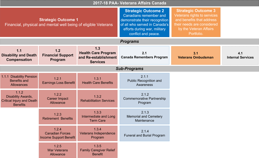 Veterans Affairs Canada’s Strategic Outcomes and Program Alignment Architecture (PAA) of record for 2017–18 are shown below: