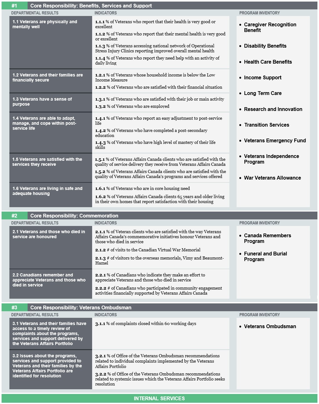 VAC’s approved Departmental Results Framework (DRF) and Program Inventory (PI) of record for 2020–21 are as follows: