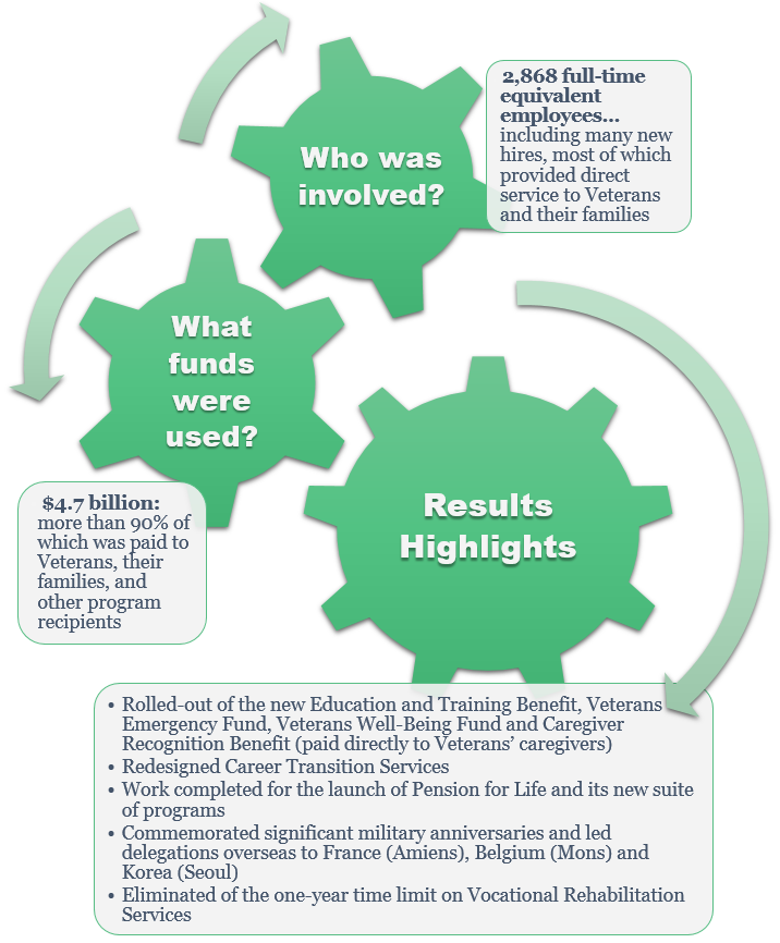 - Rolled-out of the new Education and Training Benefit, Veterans Emergency Fund, Veterans Well-Being Fund and Caregiver Recognition Benefit (paid directly to Veterans’ caregivers)
