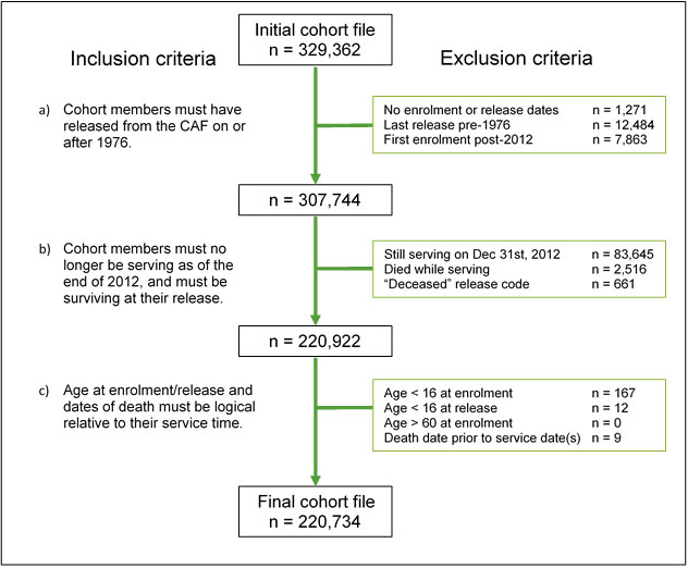 The VSMS follows CAF Regular Force and Class C Reservist Veterans who released from the CAF between January 1, 1976 and December 31, 2012. The cohort was defined using pay data from DND’s Central Computerised Pay System (CCPS) and death records from Statistics Canada’s Canadian Vital Statistics Database (CVSD) under the following inclusion criteria: