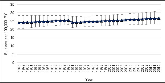 When calculating age-adjusted rates, small numbers can cause the trends to become unstable. Overall age-adjusted rates are presented for the 1976 to 2012 study period. In addition, annual age-adjusted rates are presented in this report; however, it should be noted that small numbers of deaths (the numerator) and/or small populations (the denominators) can lead to statistically unstable rates. For rates, 95% CIs were calculated using either normal approximation (death counts ≥ 100) or the exact Poisson method (deaths counts < 100). Linear trends were generated and used to estimate temporal suicide trends for Veterans and the CGP.