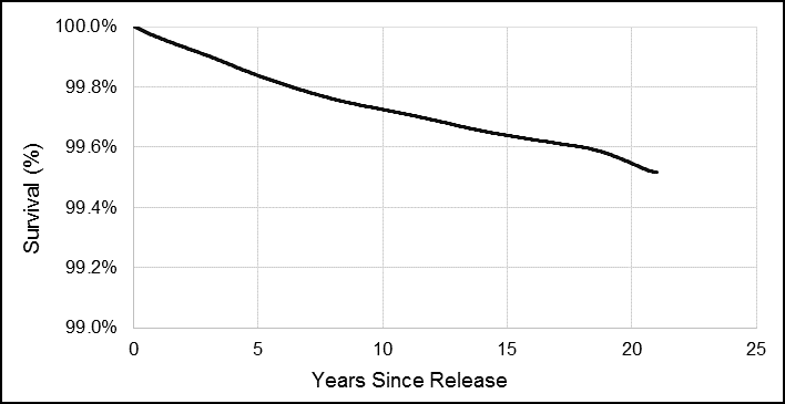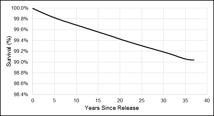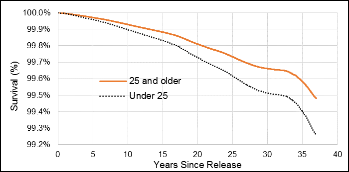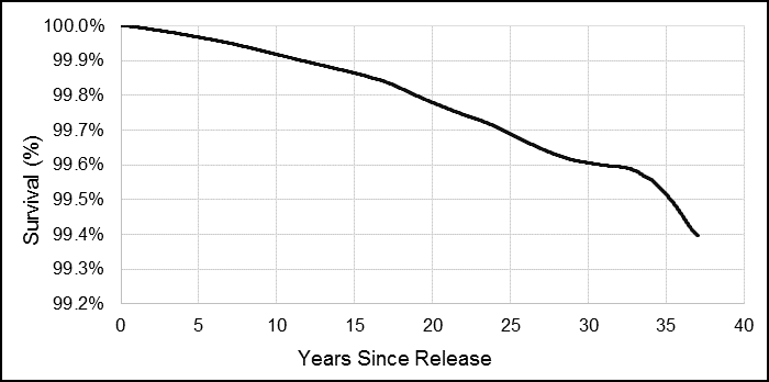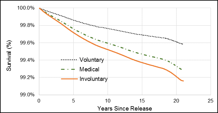 Survival functions were generated to examine the risk of suicide over time since release. For this study, the survival functions visually portray the probability of not dying by suicide at each time point since release from the CAF. In summary, a flat survival curve that remains close to 100% suggests that the likelihood of dying by suicide is low. However, when the survival curve drops sharply towards 0, this means that the risk of suicide is high at that time period. For rare events like suicide, it would be expected that the survival curve would not drop considerably below 100% as most Veterans are expected to live full lives beyond 37 years after release. To protect privacy, survival functions were smoothed to eliminate steps and the possibility of calculating the frequency of suicides by date from the charts.