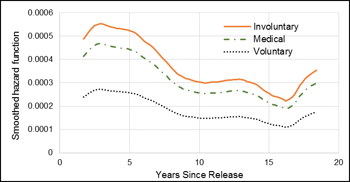 With the addition of reason for release to the Cox model, male Veterans who had an involuntary release between 1992 and 2012 had a statistically significant HR of 2.03 compared to those with a voluntary release (Table 2). Male Veterans who had a medical release had an HR of 1.72 compared to those who released voluntarily, and this was also statistically significant. The effect of reason for release was observed in the hazard function, where both those male Veterans who released involuntarily and medically had the greatest suicide risk (Figure 11). This difference was most notable within the first five years after release, after which it decreased quickly.