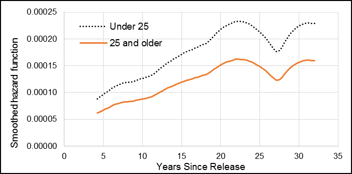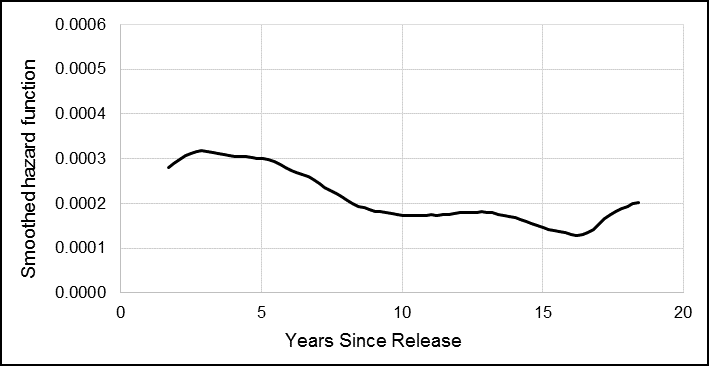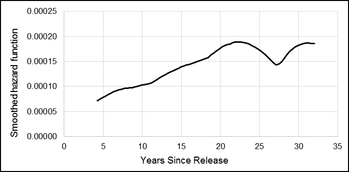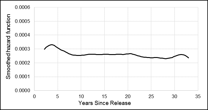 The smoothed hazard function curve showed the change in risk over time, and how for male Veterans, the risk of suicide was the highest approximately four years after release, and then decreased slightly or remained constant over the next three decades (Figure 2).