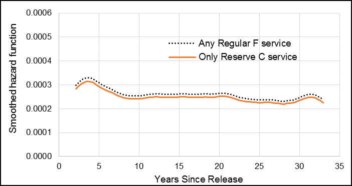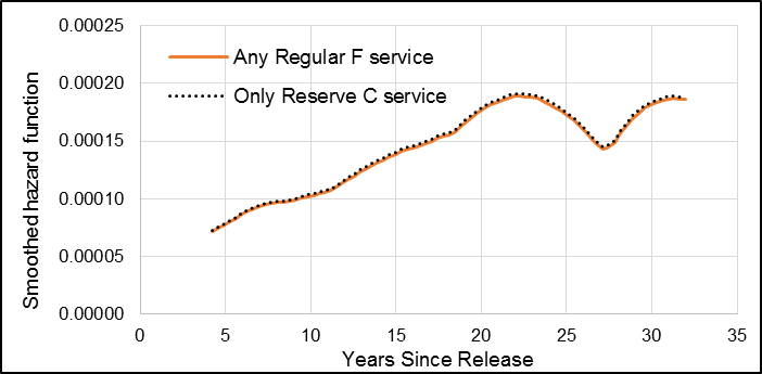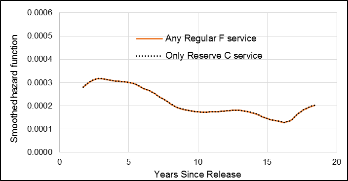 When examining the partial 1992 to 2012 cohort of male Veterans, male Veterans who had only reservist service time had the same risk of suicide as those with Regular Force time (HR: 1.00) (Table 2). The smoothed hazard curves demonstrated visually how there was no difference in suicide risk between the two component categories as the two curves overlapped (Figure 8).