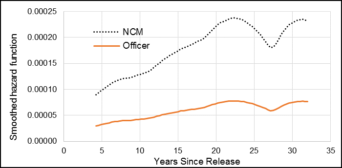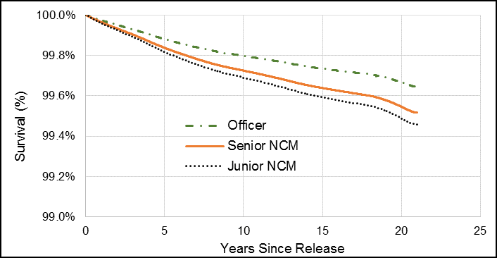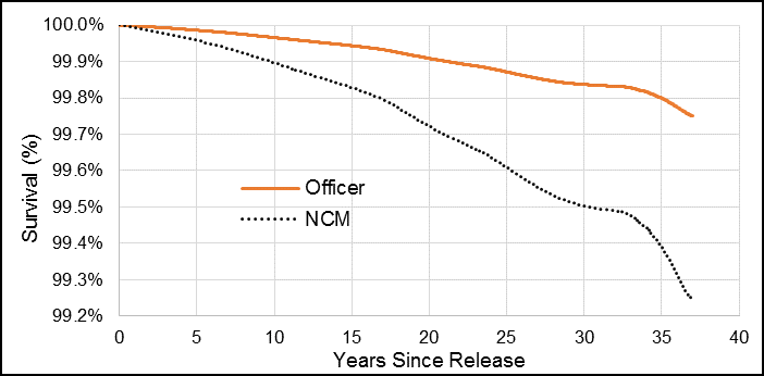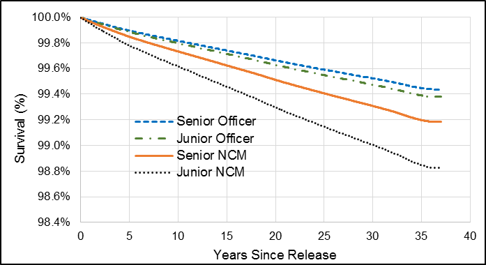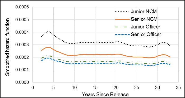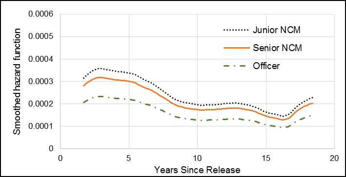 Compared to Veterans who released as Officers (Junior and Senior combined), Junior NCMs had an HR of 1.53, and this was statistically significant (Table 2). Senior NCMs had an HR of 1.36, but this was not statistically significant. Similar to the full 1976 to 2012 cohort, Junior NCMs had the greatest change in hazard compared to the other ranks (Figure 9).