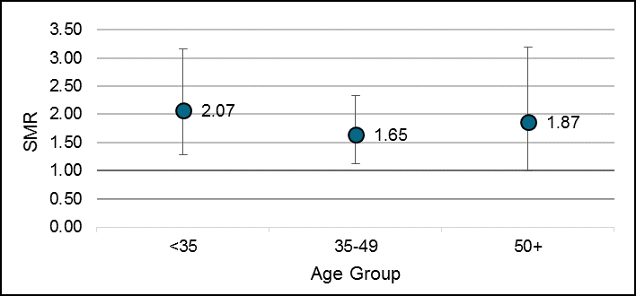 In compliance with STC privacy regulations, all risk factor categories, SMRs and rates were collapsed and presented in age groups or time period categories that ensured minimum cell counts of 10.