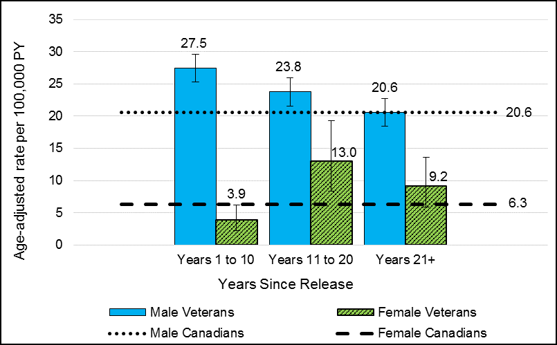 - Male Veteran suicide rates where highest in the first decade after release and decreased to Canadian male levels after 20 years. Males were at highest risk of suicide approximately four years after release.