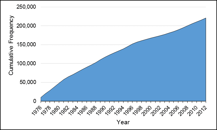 Starting with 9,885 Veterans who released in 1976, the VSMS cohort increased to 200,734 Canadian Veterans by the end of the study period in 2012 (Appendix A, Figure A-1) (Simkus, VanTil and Pedlar, 2017). The Veteran cohort was 89% male, 60% released at a Junior NCM rank, and 26% released since 2000. Some cohort members had a combination of service experience in both the Regular Force and as Class C Reservists during their careers. The majority of the cohort (95%) had been part of the Regular Force at some time in their military careers, and 14% had at least some Class C Reserve service time. See Appendix E for a more detailed description of the distribution of age and sex in the VSMS cohort.