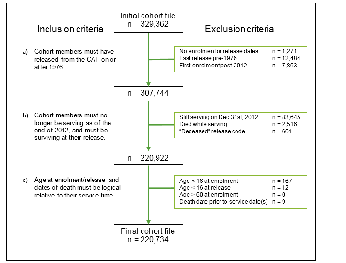 After military personnel leave the Canadian Armed Forces (CAF), they receive health care from provincial and territorial health services, and their medical and mortality data are not routinely captured by VAC. To identify Veterans in the Canadian vital statistics databases, VAC and DND worked together to identify a cohort of over 200,000 released Regular Force and Reserve C Force (deployed) personnel from the DND administrative databases, which was then linked to death records at STC.