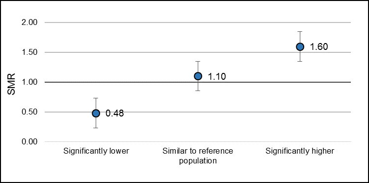 Figure D. Example on how to interpret standardised mortality ratios (SMRs) and their corresponding confidence intervals (CIs).