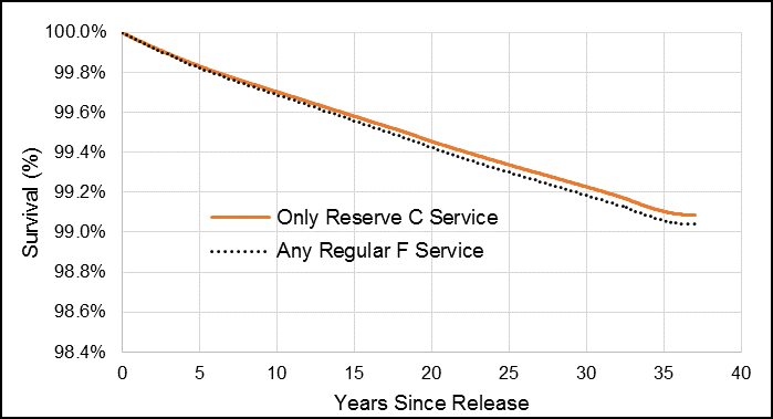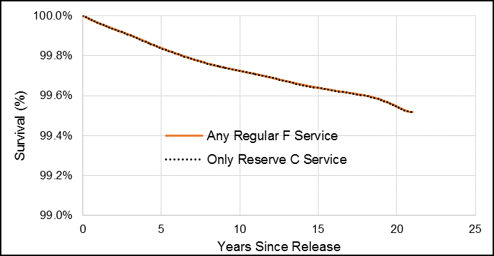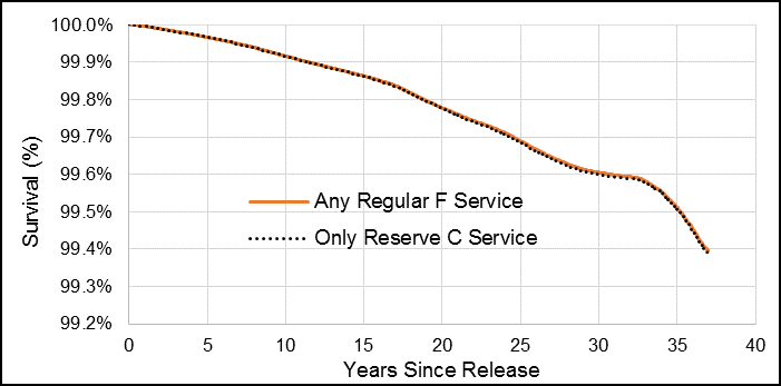 Figure G1. Male Veteran smoothed survival function for risk of dying by suicide by component (Regular Force vs. Reserve Force Class C service only), 1976 to 2012 releases.