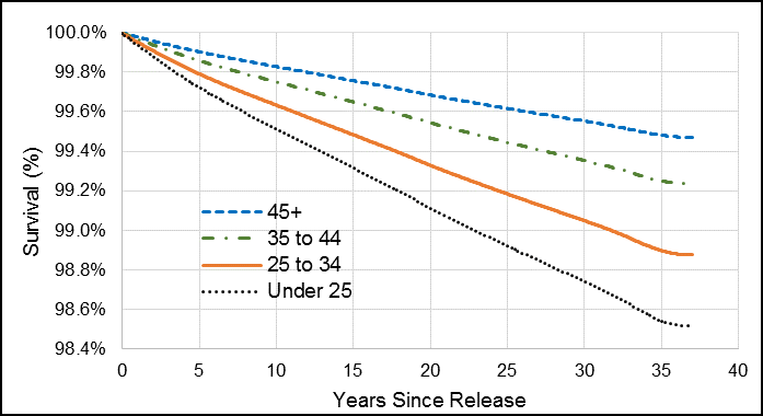 Figure G3. Male Veteran smoothed survival function for risk of dying by suicide by age at release, 1976 to 2012 releases.