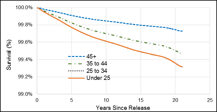 Figure G6. Male Veteran smoothed survival function for risk of dying by suicide by age at release, 1992 to 2012 releases.
