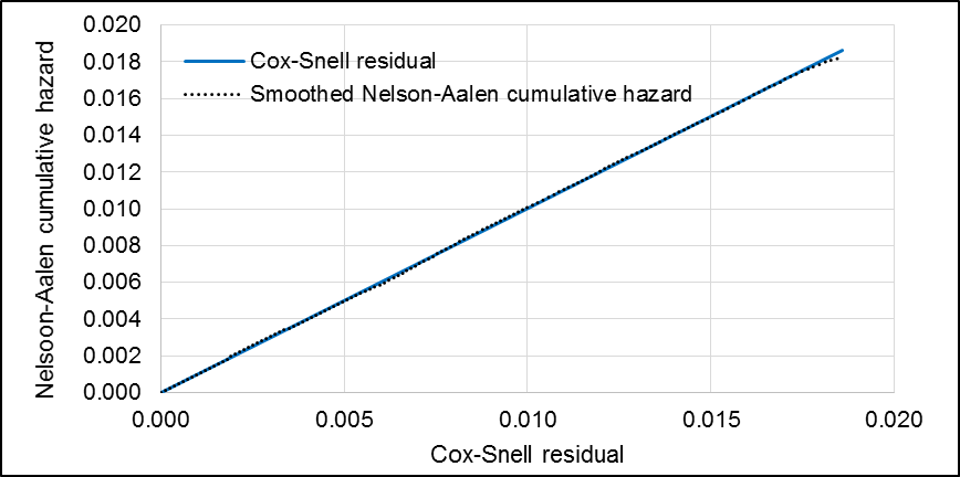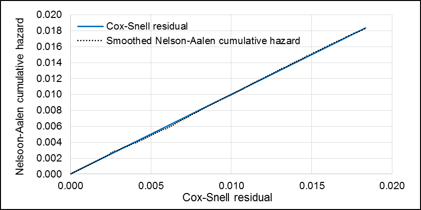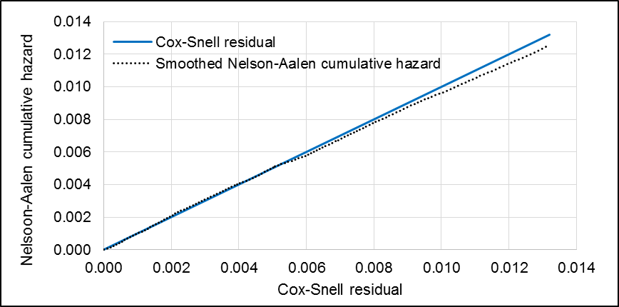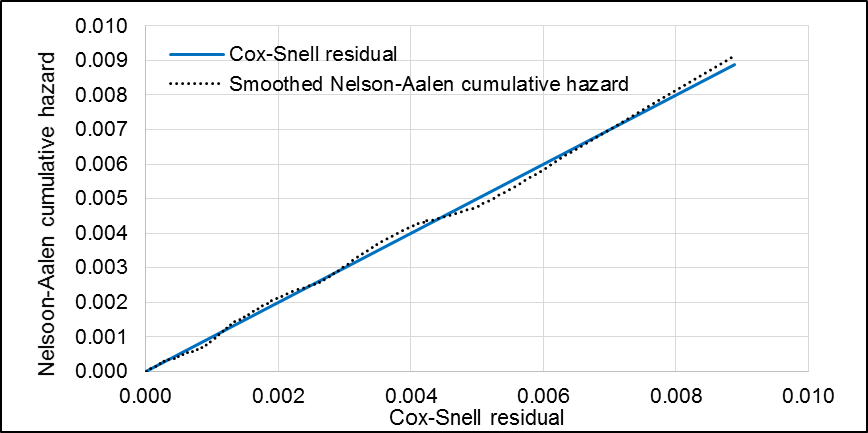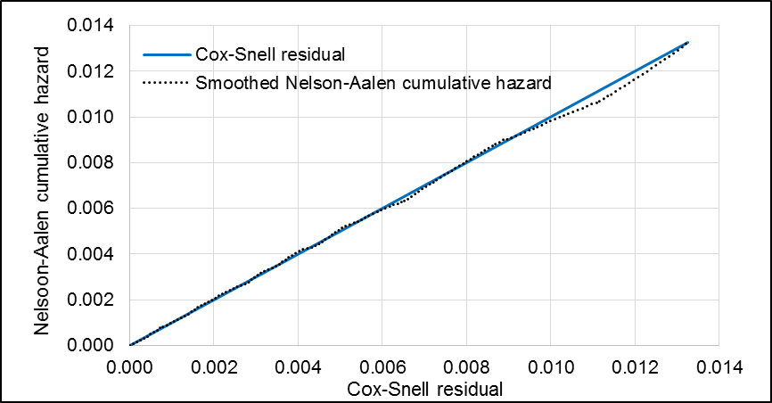 Schoenfeld and scaled Schoenfeld residuals tests showed no violations of the proportionality assumption (p=0.8141). Comparing the model’s Nelson-Aalen cumulative hazard function to the Cox-Snell residuals, it was observed that the model fit the data fairly well (Figure H5).