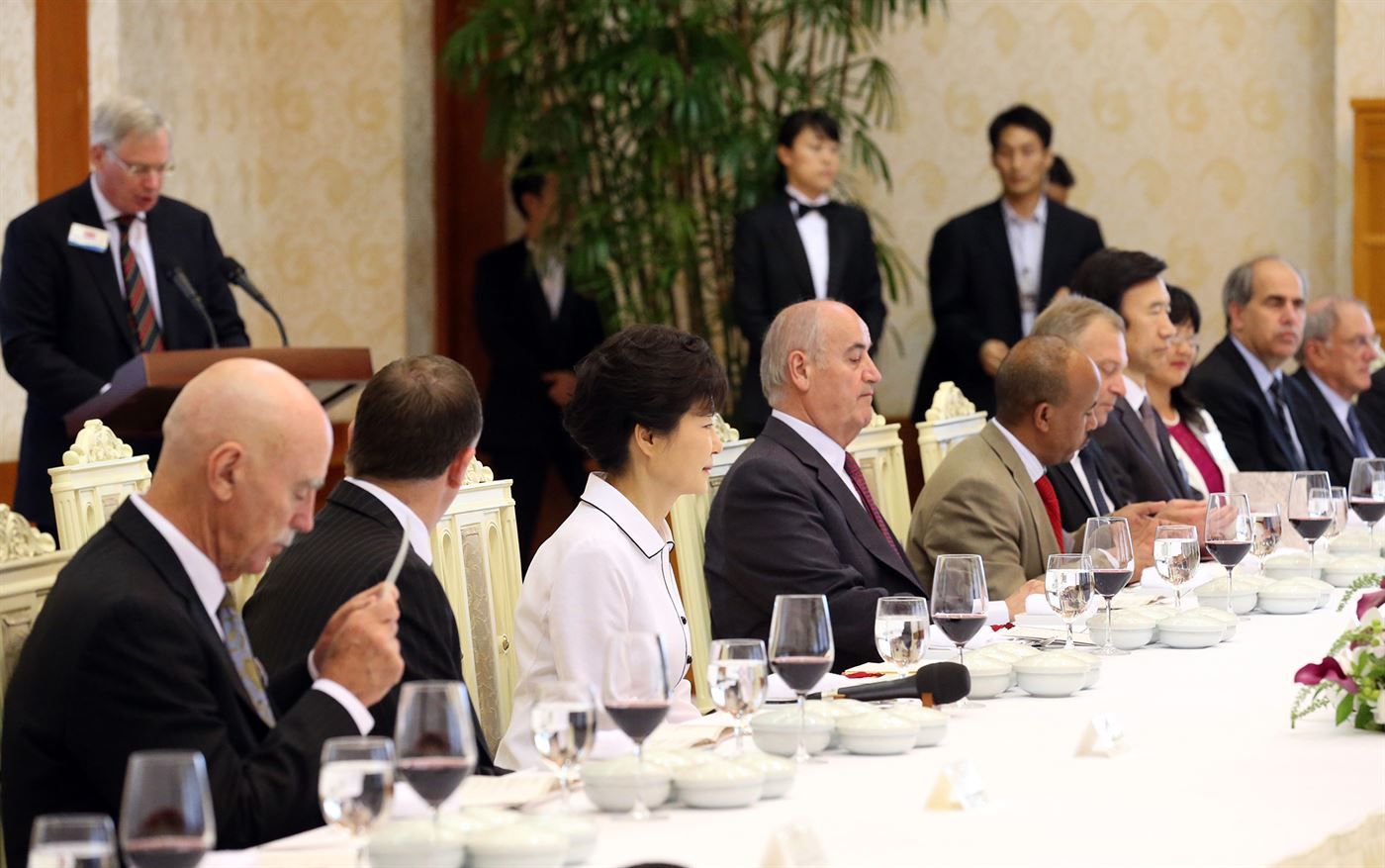 Canadian Veterans Affairs Minister Julian Fantino and Korean President Geun-hye Park (centre) listen to speakers during at a VIP luncheon at Blue House, the president’s official residence.