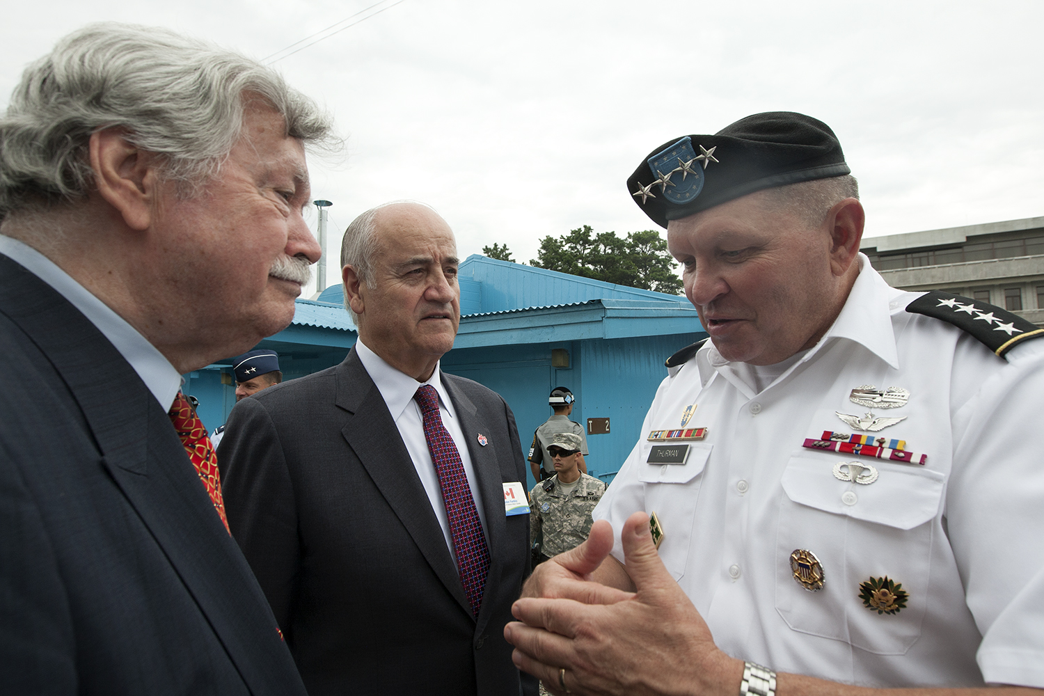 (L-R) Vince Courtenay, a Canadian Veteran of the Korean War, and Minister Julian Fantino, meet with Gen. James D. Thurman, Commander of the United Nations Command, following an event at the demilitarized zone between South and North Korea to mark the 60th anniversary of the signing of the Korean War Armistice.