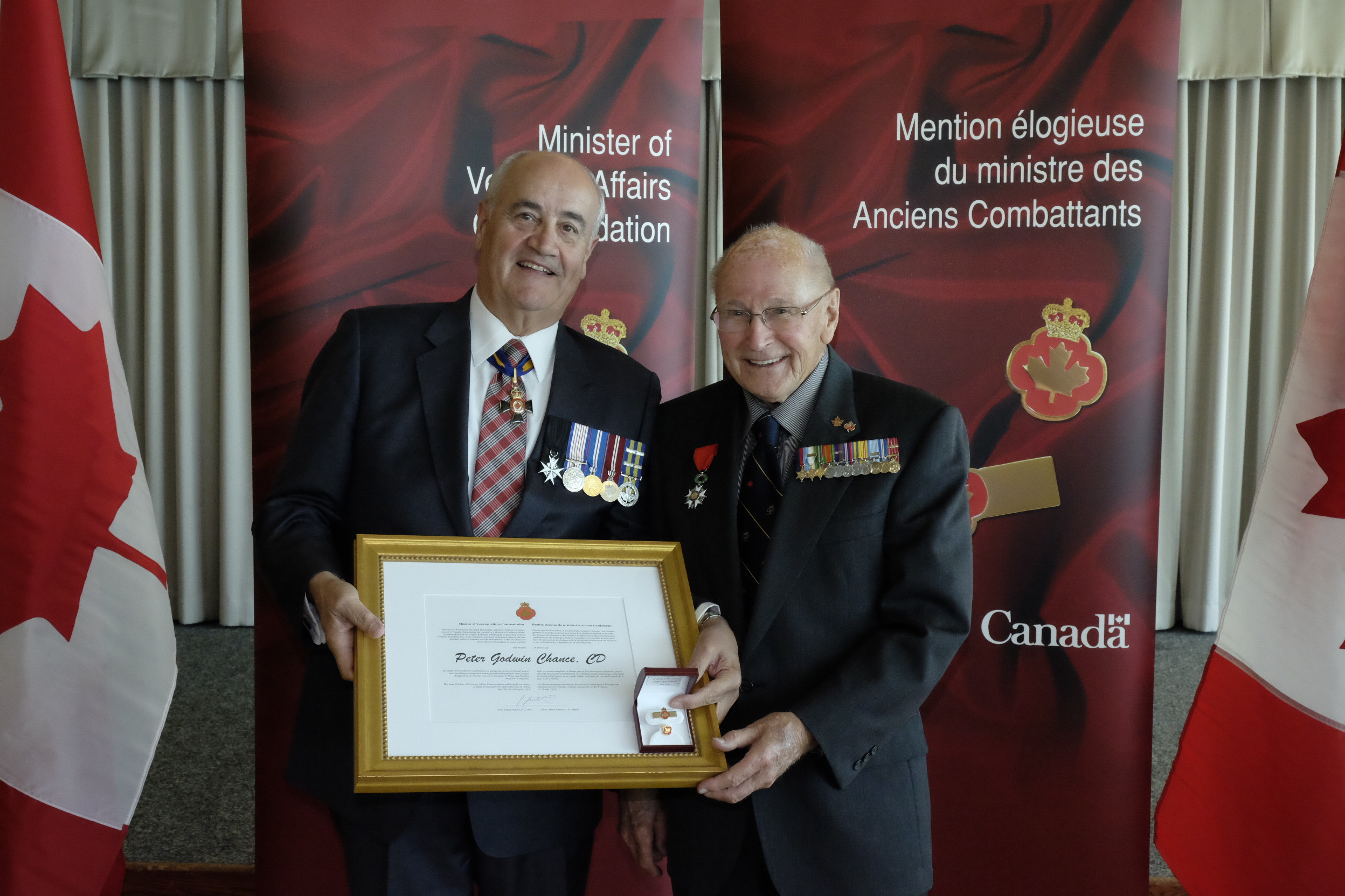 The Honourable Julian Fantino, Minister of Veterans Affairs, with Minister of Veterans Affairs Commendation recipient Peter Godwin Chance at a ceremony in Victoria honouring individuals for their exemplary service to Veterans.