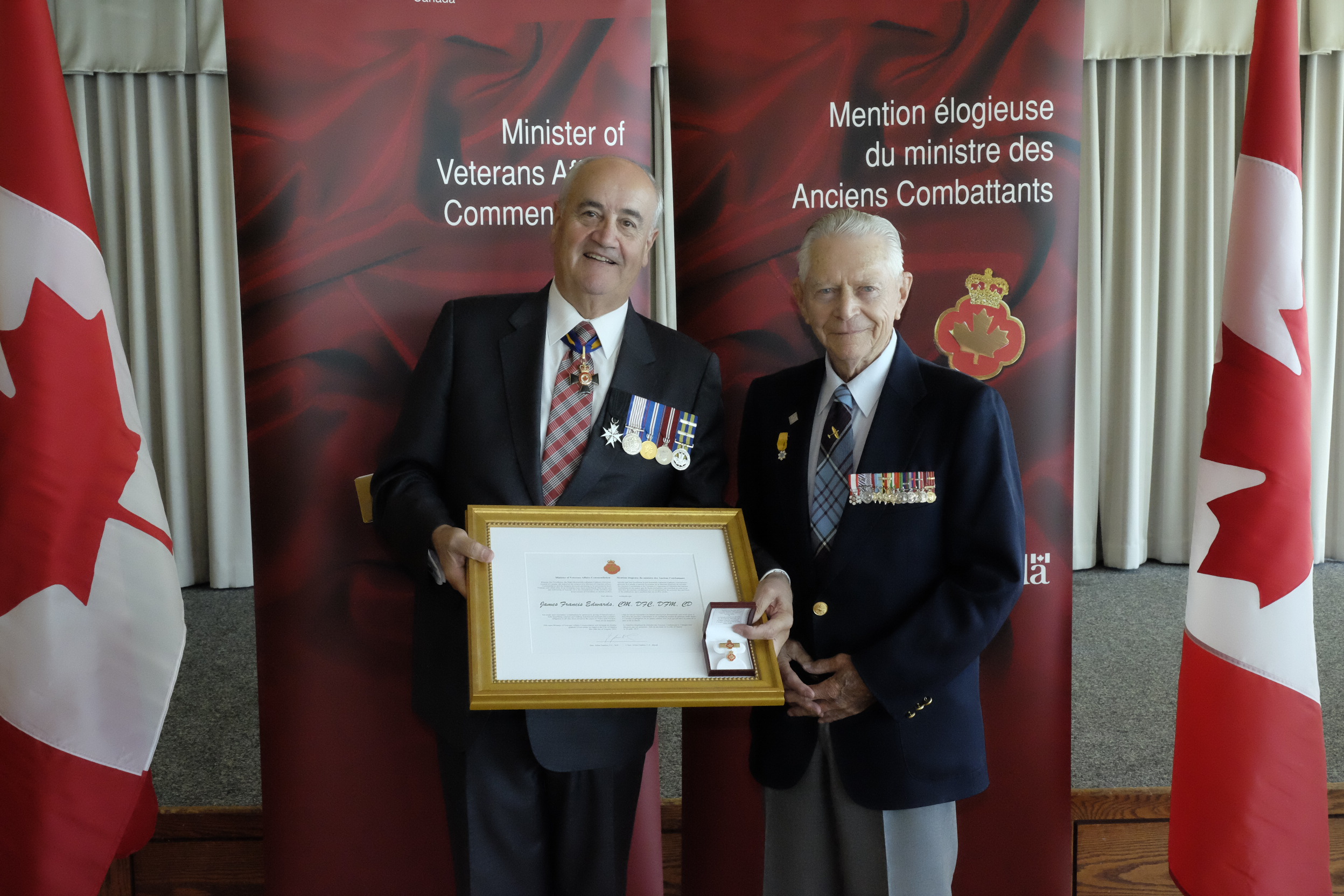 The Honourable Julian Fantino, Minister of Veterans Affairs, with Minister of Veterans Affairs Commendation recipient James Francis Edwards at a ceremony in Victoria honouring individuals for their exemplary service to Veterans.