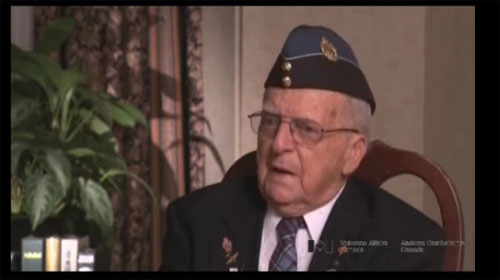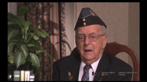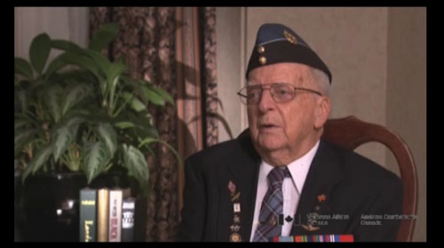 Mr. Warren's Spitfire is struck by shrapnel or ack-ack, leaving a hole in the cockpit and him with a numb leg. He jettisons his bombs and returns to base. Smelling something burning, his investigation finds a piece of molten metal in a tin box in his tunic pocket. During this clip, Mr. Warren also explains why Spitfire pilots seldom ejected if their plane was shot down.