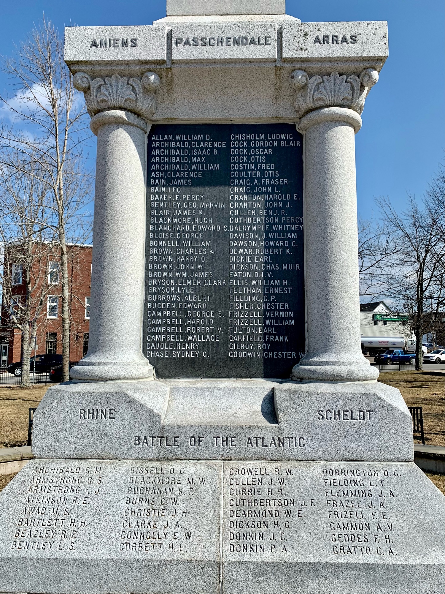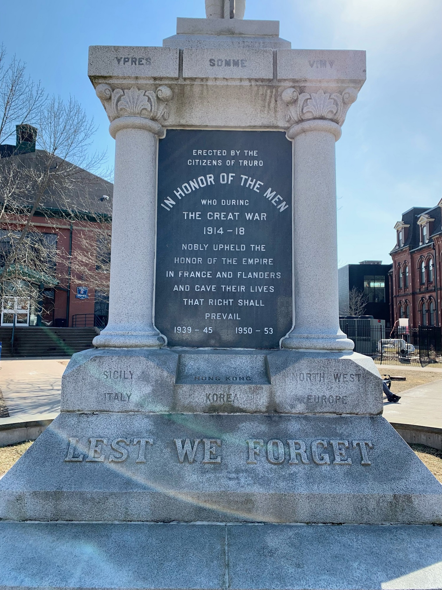 The Truro Cenotaph was unveiled by His Honor Lieutenant Governor Tory on September 26, 1926, to honour the soldiers who fought in the First World War. At the time, the memorial was called Memorial to the Fallen Soldiers. Thousands of citizens from Truro and Colchester County attended the parade and ceremony. Stationed at the four corners of the base of the cenotaph were soldiers representing four different branches of service. Sergeant Intcliff, Infantry; Petty Officer Lundy, Navy; Private Henderson, Highlanders; and Private. Davidson, Cavalry. At a cost of $10,000, the memorial has since been taken care of by the Legion and towns people.