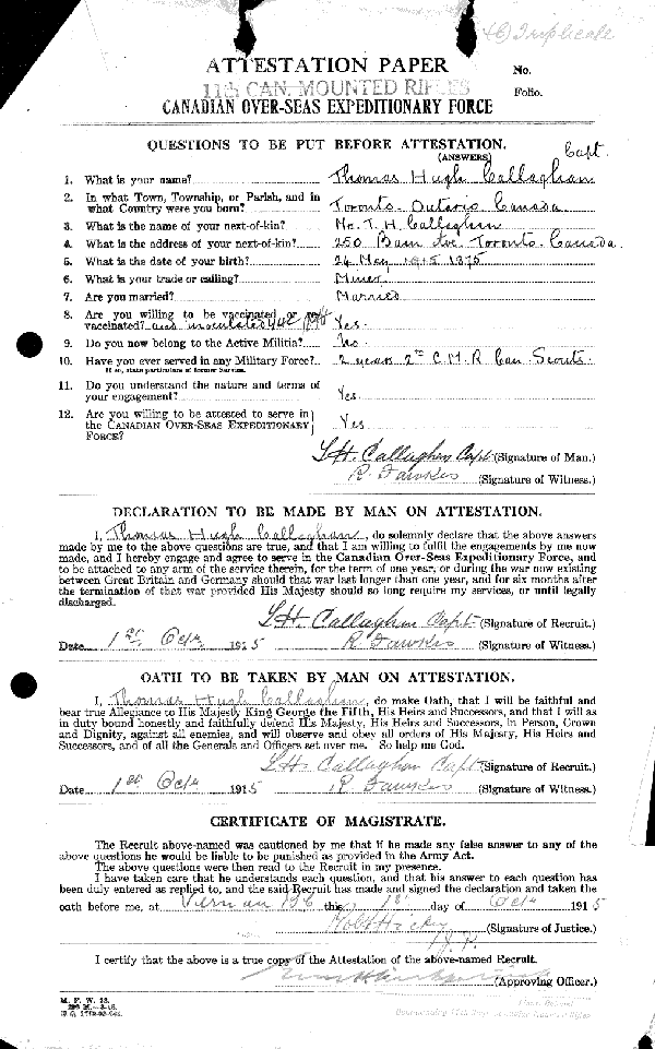 Son of Hugh and Ethel Callaghan. Husband of Mary Wilson Callaghan of Toronto, Ontario. Served in the South African Campaign.