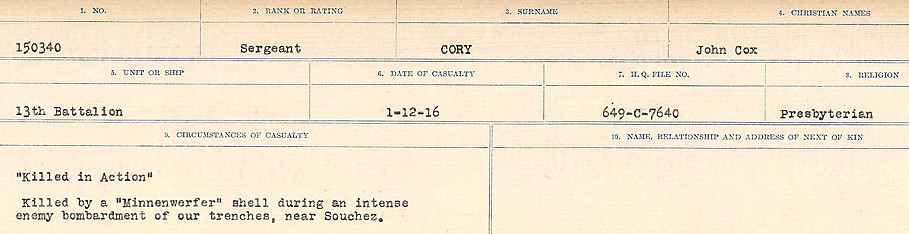 Son of Thomas and Annie Cory, of Carlyle, Saskatchewan. Born in Manitoba.
