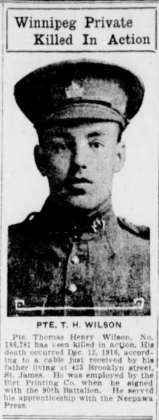 Son of Mr. and Mrs. Thomas H Wilson, of 294, Berry St., St. James, Manitoba.