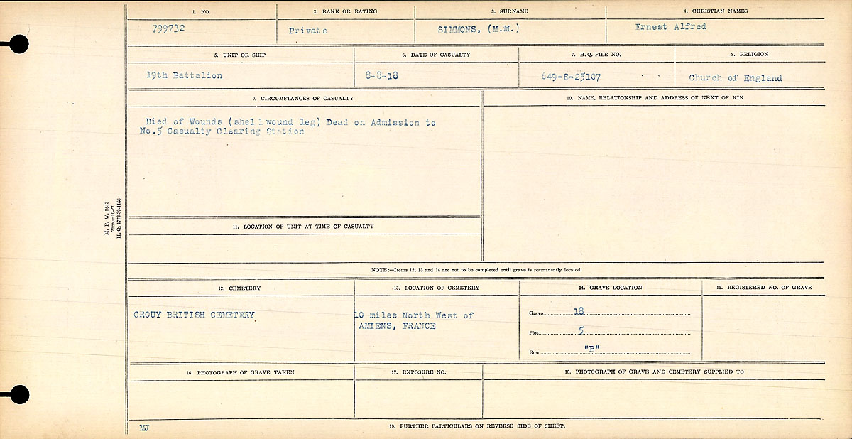 Crouy is a village about 16 kilometres north-west of Amiens on the west side of the River Somme, on the Amiens-Abbeville main road. The CROUY BRITISH CEMETERY is a little south of the village on the west side of the road to Cavillon and there is a Commonwealth War Graves Commission signpost on the main road.