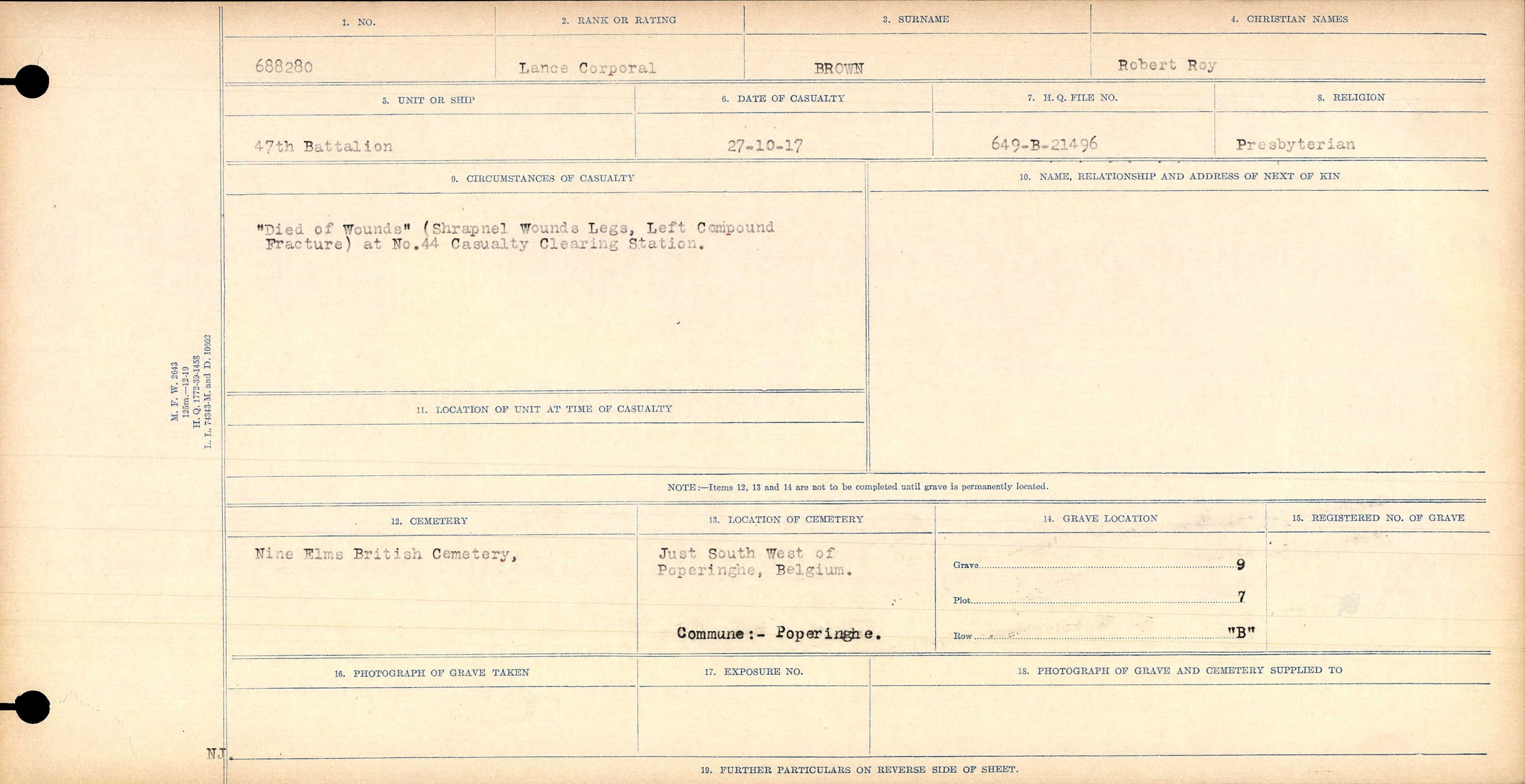 NINE ELMS BRITISH CEMETERY is located 11.5 Km west of Ieper town centre on the Helleketelweg, a road leading from the N308 connecting Ieper to Poperinge. From Ieper town centre the Poperingseweg (N308), is reached via Elverdingsestraat then over two small roundabouts in the J. Capronstraat. The Poperingseweg is a continuation of the J. Capronstraat and begins after a prominent railway level crossing.