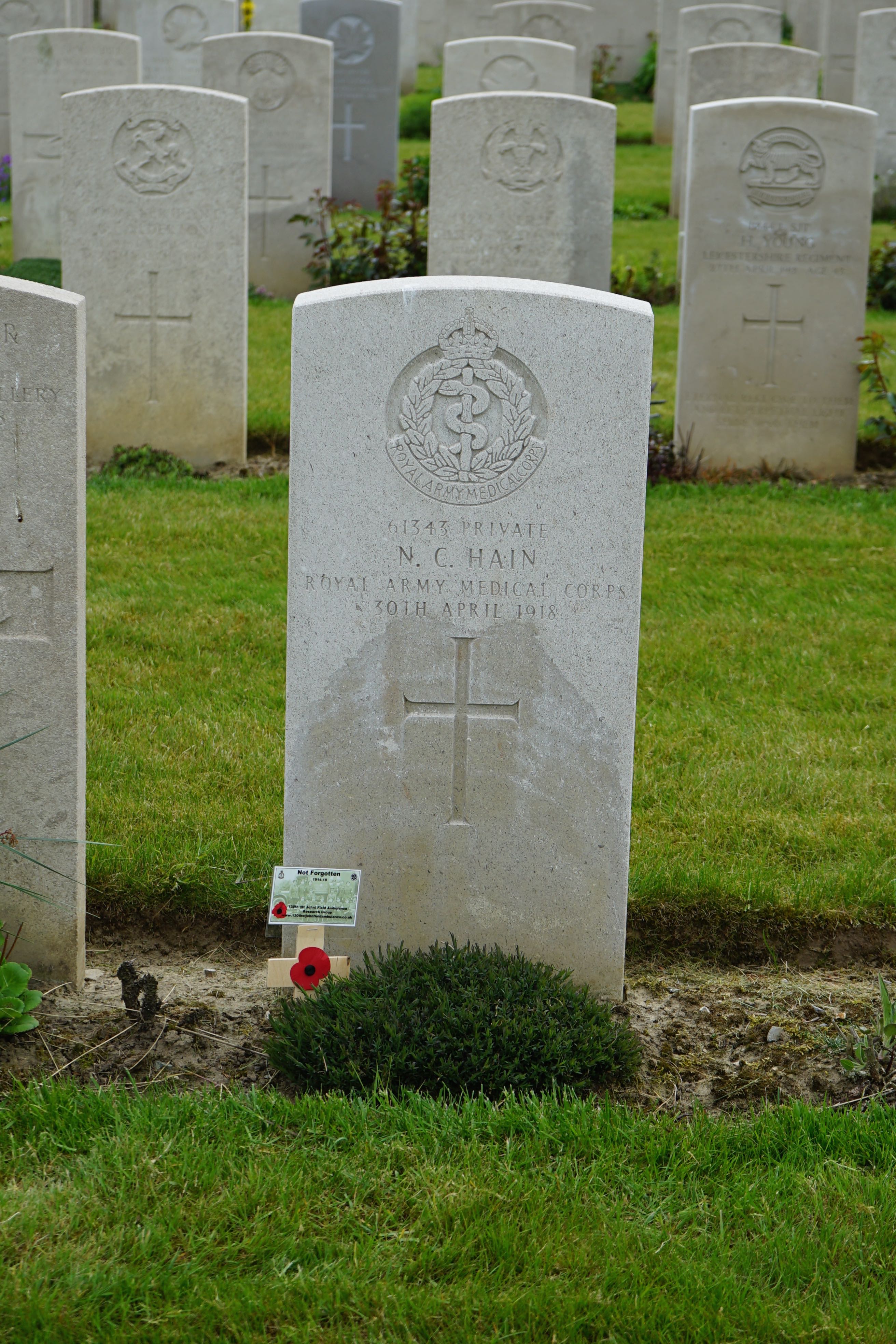 During the First World War, Brandhoek was within the area comparatively safe from shell fire which extended beyond Vlamertinghe Church. Field ambulances were posted there continuously and the Military Cemetery was opened early in May 1915 in a field adjoining the dressing station. It closed in July 1917 when the New Military Cemetery was opened nearby, to be followed by the New Military Cemetery No 3 in August 1917. Brandhoek New Military Cemetery No 3 contains 975 First World War burials. The cemetery was designed by Sir Reginald Blomfield.