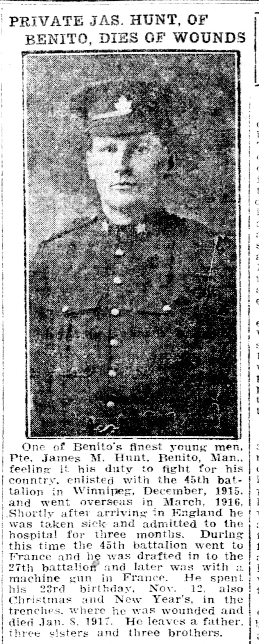 Son of Isaac E. and Margaret Hunt, of Benito, Manitoba.