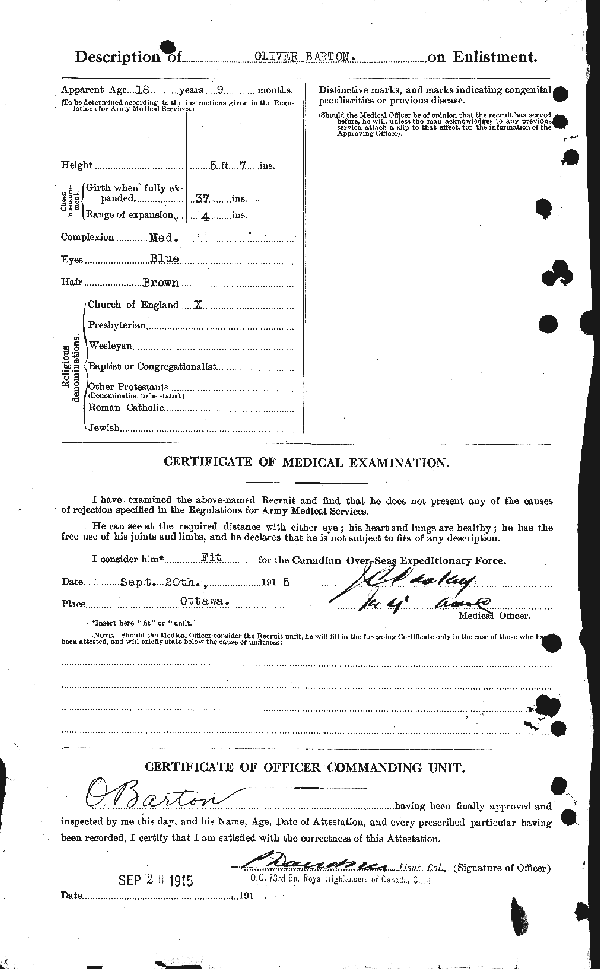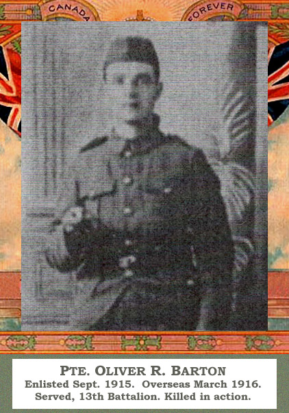 Son of Robert and Margaret S. Fraser Barton, of Vankleek Hill, Ontario. Enlisted Septenber, 1915.