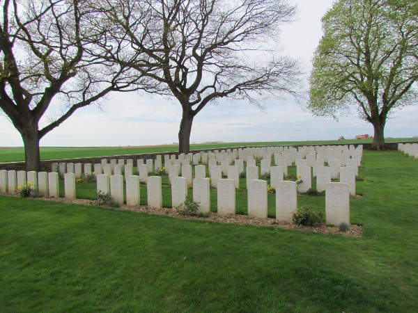 Courcelette is a village some 10 kilometres north-east of the town of Albert, just off the D929 road to Bapaume. The Courcelette British Cemetery is approximately 1 kilometre west of the village on the south side of a track, suitable for cars, from the secondary road from Courcelette to Pozieres. The route is signposted in the village.